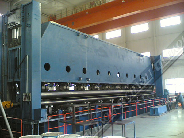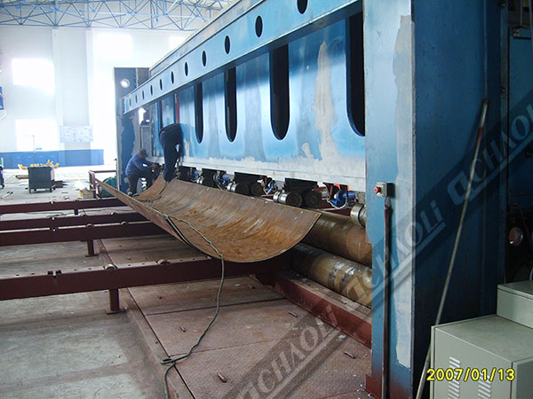 船用三輥對稱式卷板機結構型式為三輥對稱式,上輥在兩下輥中央對稱位置作垂直升降運動,通過液壓缸內的液壓油作用于活塞桿而獲得,為液壓傳動;通過特殊設計減速機分別帶動全滾動軸承的兩下輥作旋轉運動,為卷制板材提供扭矩;在下輥下部設有多組托輥,以提高下輥的剛度,并可進行垂直調節;在上輥的上部設有剛性大梁,在大梁與上輥之間設有多組托輥,以提高上輥的剛度;適用于超寬圓弧形零件的卷制。可卷板厚3mm-50mm,板寬21000mm的板料。