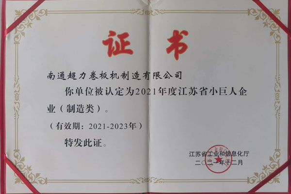 卷板機 >> 新聞中心 >> 超力卷板機獲2021-2023年度江蘇省小巨人企業(yè)證書
